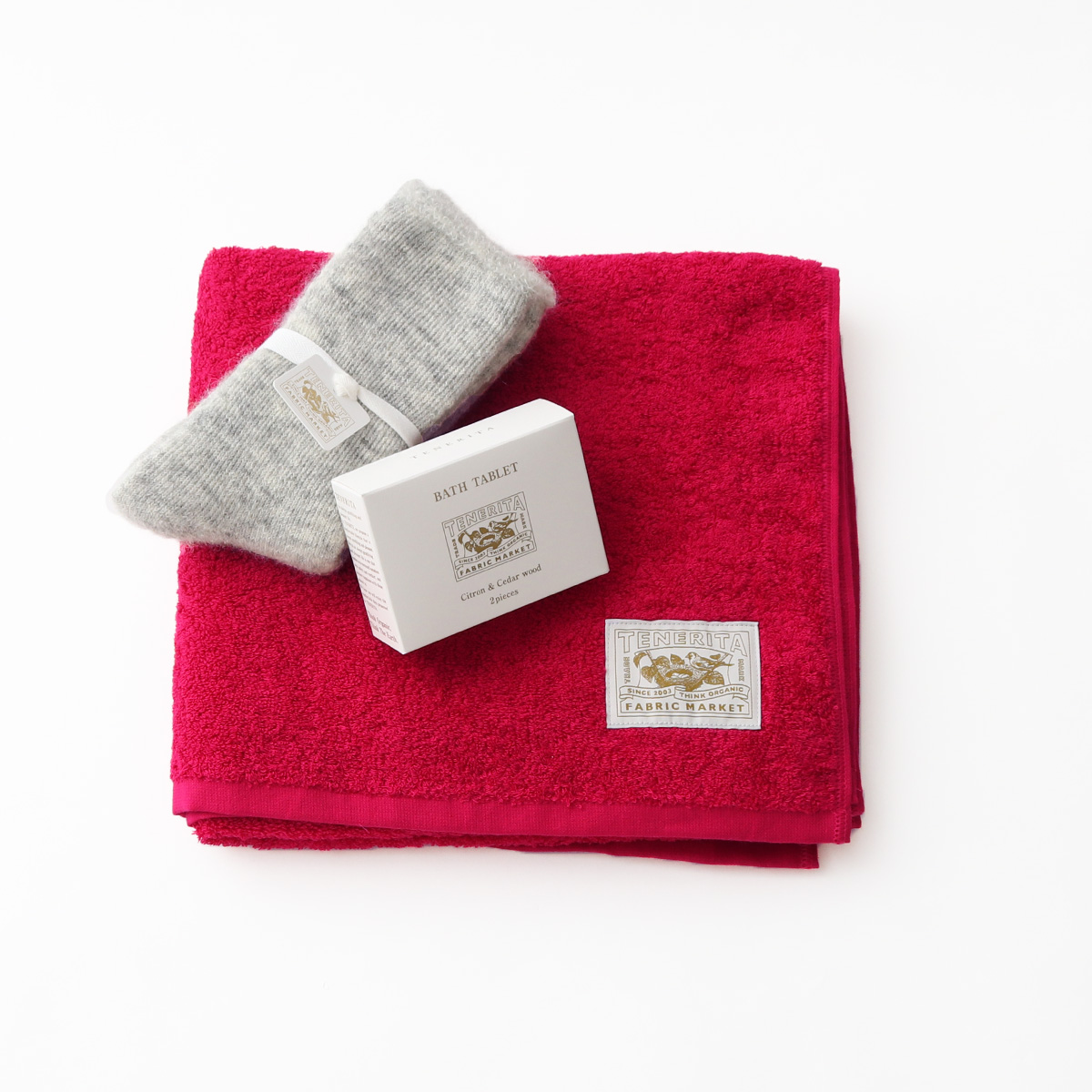 思わずふれずにはいられない究極の柔らかさの超甘撚りフェイスタオルの限定カラーと、キッドモヘアを使用した靴下、天然塩や砂糖、オーガニック植物エキスを配合したバスタブレットを特別なブルーミングレッドボックスに入れたギフトセットです。