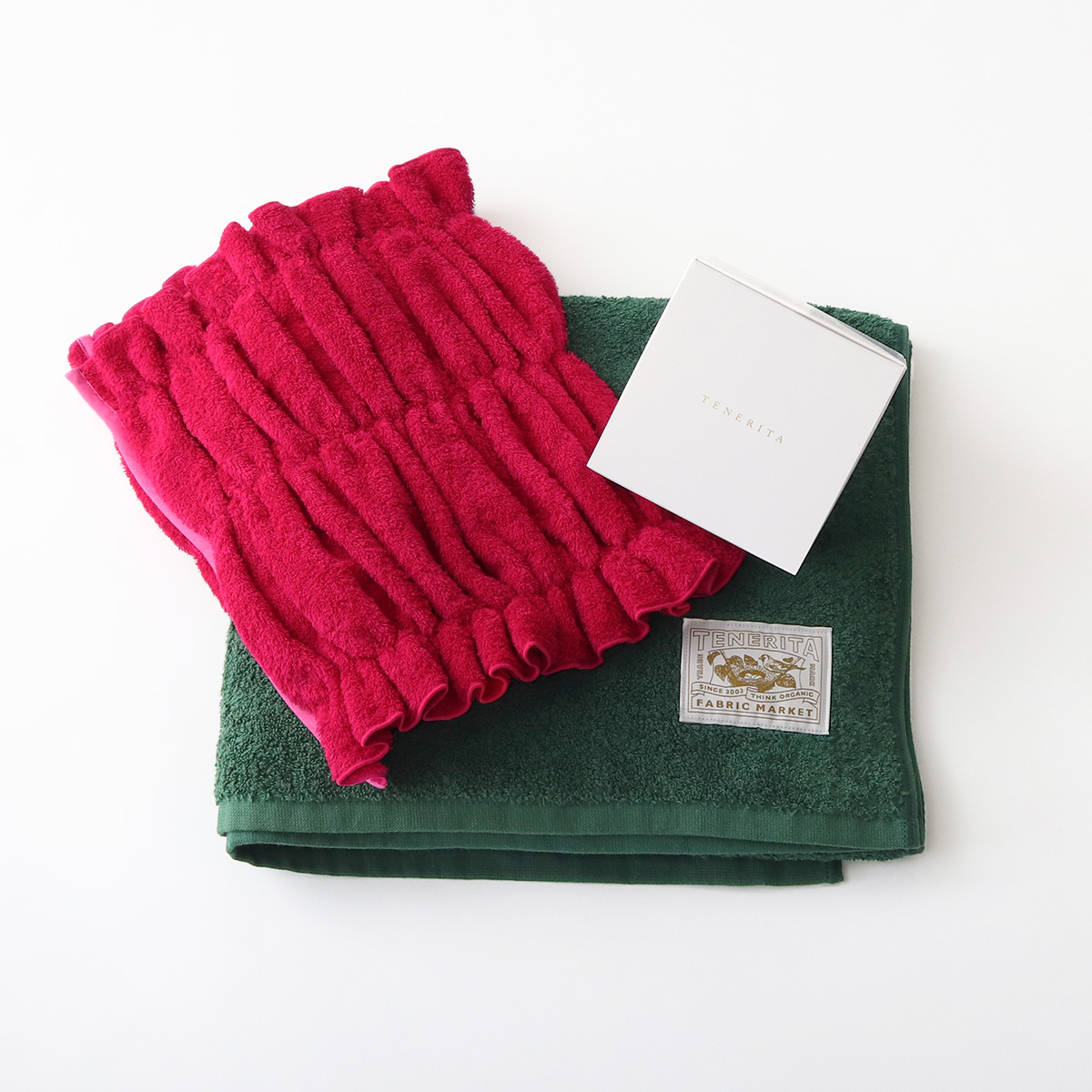 思わずふれずにはいられない究極の柔らかさの超甘撚りバスタオルショートの限定カラーと、お風呂上りに頭に巻くだけで髪をまとめられるヘアタオル、天然塩や砂糖、オーガニック植物エキスを配合したバスタブレットを特別なブルーミングレッドボックスに入れたギフトセットです。