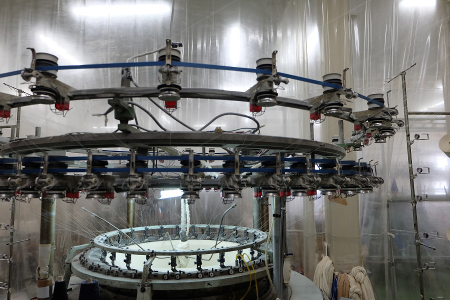 高野口がもつもう一つの特殊な技術を使った素材に、パイルジャージがあります。 パイルの肌触りのよさに、のびのびとした伸縮性が加わったパイルジャージ素材。この素材のための編み機は、かつては多数普及していましたが、手入れや稼働にとても手間がかかるため次第に使うメーカーが減少し、現在日本には数台しか存在しません。そのうえ、テネリータが追い求めるきめ細やかさをかなえる編み機は、さらにごくわずかに限られます。 まわりのひとまでも思わず頬ずりしたくなるタオルのような心地よさと生地の伸び縮みによる抜群の着心地のルームウェアは、高野口にある幻のような機械のおかげで実現しています。