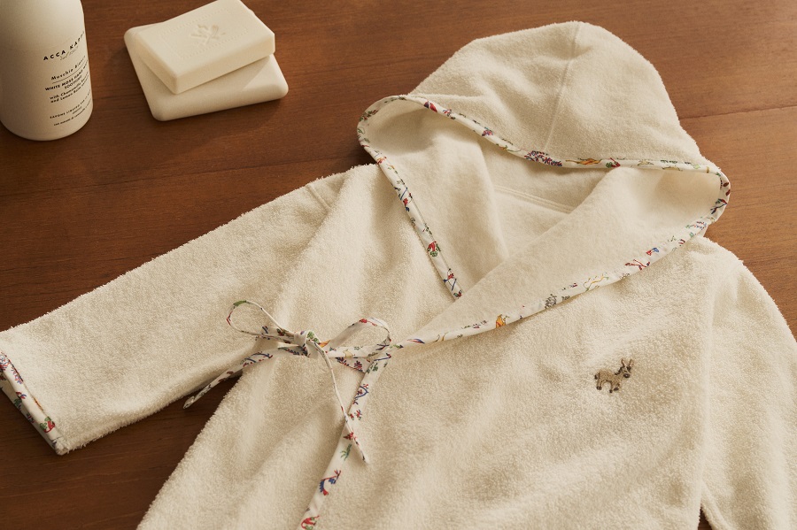柔らかさと伸縮性を兼ね備えたこの素材は、和歌山県高野口にて希少性の高い編み機を使い、職人の技術によって丁寧に時間をかけて編み上げられています。タオルと同じパイル組織を表面に採用しながらも、くつろぎの時間にふさわしい、のびのびとした着心地をかなえます。